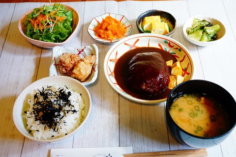 煮込みハンバーグ、唐揚げ2個、その日の手作り惣菜3品、、無農薬レタスのサラダ、お味噌汁、選べるご飯、食後のシャーベットがついています。