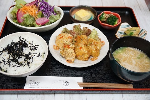 チキン南蛮、コーンのかき揚げ、3種類のおばんざい、