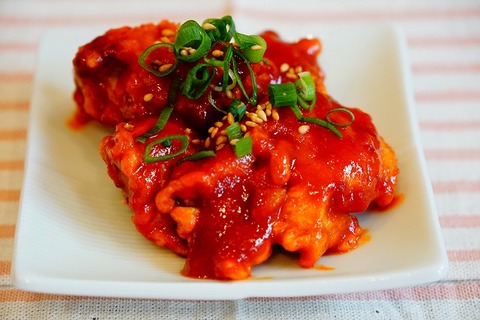 マイルドな辛さのヤンニョンジャン(甘辛ミソ)を唐揚げに絡めました。辛そうな色ですが実はちょい辛です。