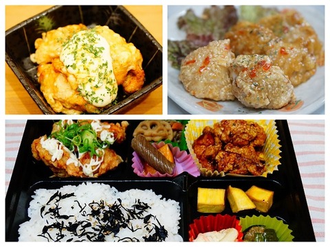 手作り惣菜3品、かつおとり天、ムネ唐、チキン南蛮、小さめご飯(ごま、ひじき)